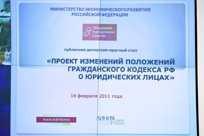 С целью формирования позиций бизнеса по поводу основных положений проекта изменений Гражданского кодекса РФ о юридических лицах, Объединение Корпоративных Юристов совместно с Минэкономразвития России и при поддержке юридических фирм «Бейкер и Макензи» и «Линия права» организовало публичную дискуссию, посвящённую обсуждению этого документа.