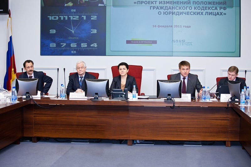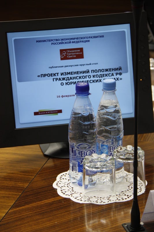 С целью формирования позиций бизнеса по поводу основных положений проекта изменений Гражданского кодекса РФ о юридических лицах, Объединение Корпоративных Юристов совместно с Минэкономразвития России и при поддержке юридических фирм «Бейкер и Макензи» и «Линия права» организовало публичную дискуссию, посвящённую обсуждению этого документа.